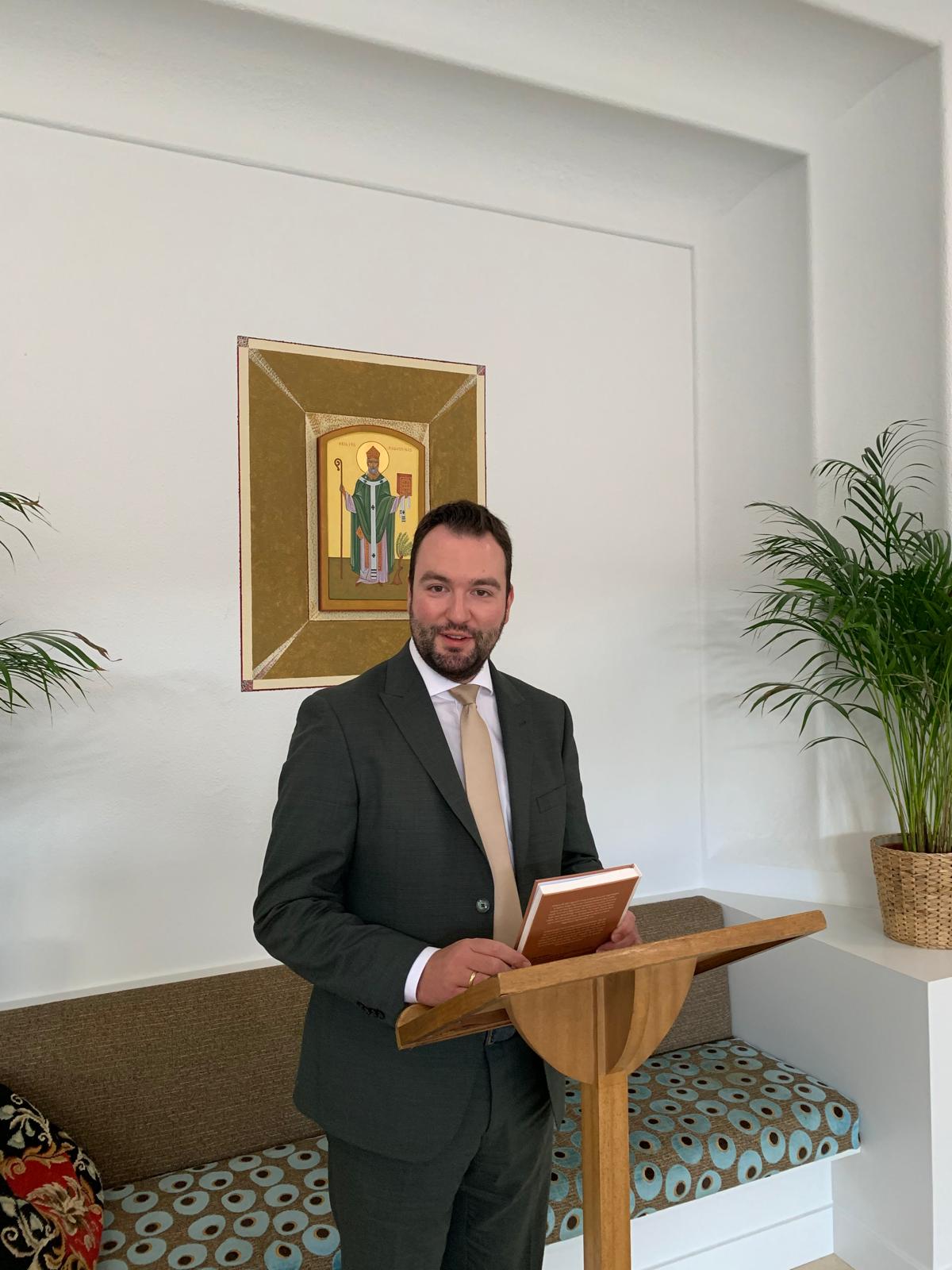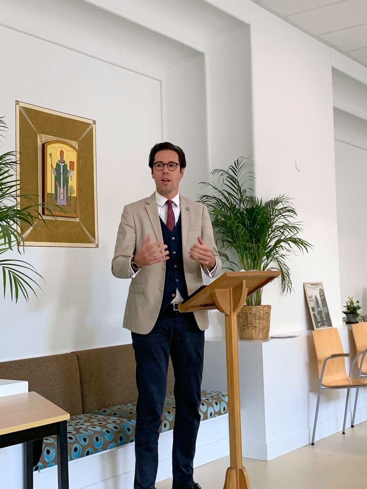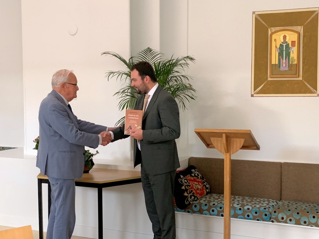 René Heij overhandigt het eerste exemplaar aan prior-provinciaal Pierre Stikkelbroeck OSA