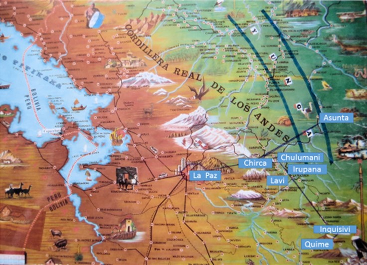 Foto's: Vereenvoudigde kaart van de Yungas. Dit gebergte vormt de flanken van de Andes. Het gebied dat tien jaar door de augustijnen bediend is, ligt ten zuiden van Chirca en Chulumani.